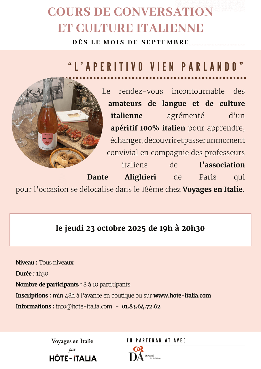 Le rendez-vous incontournable des amateurs de langue et de culture italienne agrémenté d’un apéritif 100% italien pour apprendre, échanger, découvrir et passer un moment convivial en compagnie des professeurs italiens de l’association Dante Alighieri de Paris qui pour l’occasion se délocalise dans le 18ème chez Voyages en Italie.