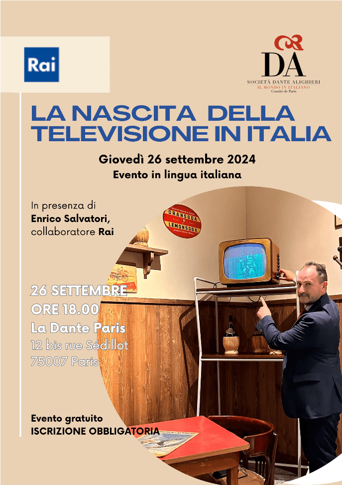 La Dante Alighieri – Comité de Paris a le plaisir de vous inviter à la conférence La nascita della Televisione in Italia en présence de Enrico Salvatori, collaborateur de la Rai depuis le 1999.