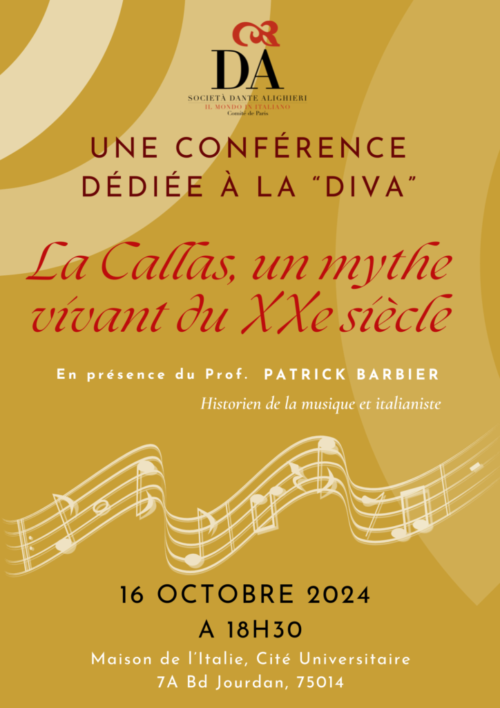 Le mercredi 16 octobre à 18h30, la Dante Alighieri – Comité de Paris a organisé la conférence « La Callas, un mythe vivant du XXe siècle » qui s’est dérouleé à la Maison de l’Italie de Paris, en présence du Prof. Patrick Barbier, historien de la musique et italianiste.