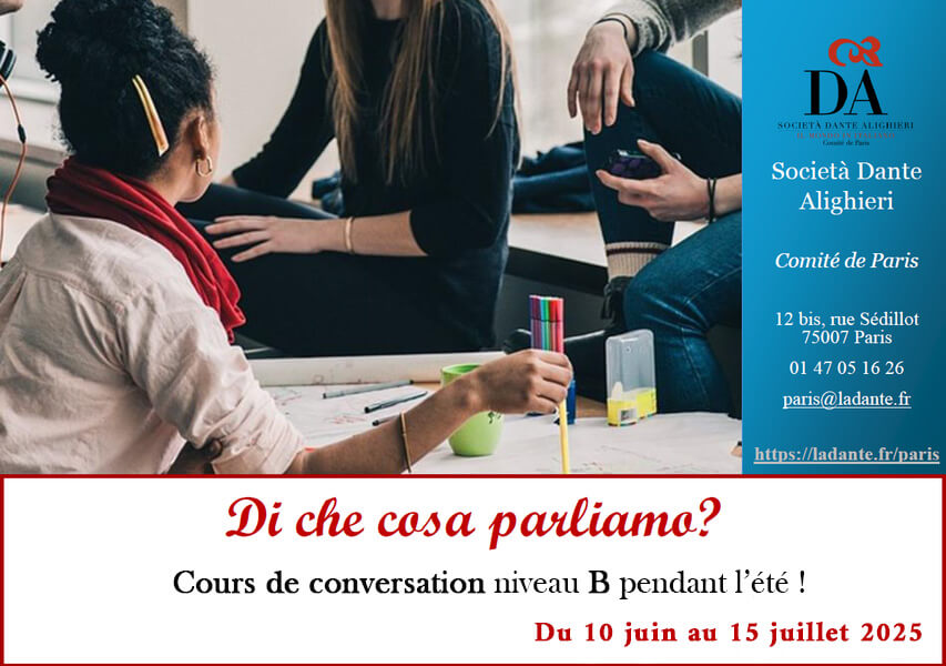 - Le tarif adhérent à la Dante Alighieri de Paris : 135€ pour 6 cours tous les mardis du 10 juin au 15 juillet 2025, de 19h à 20h30, niveau B (intermédiaire);